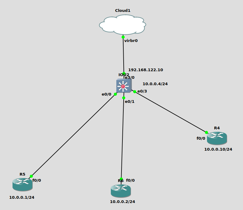 To access my virtual routers in GNS, I need to configure additional routing on my host machine. The IP network ‘10.0.0.0/24’ will be reachable via the gateway IP address ‘192.168.122.1’